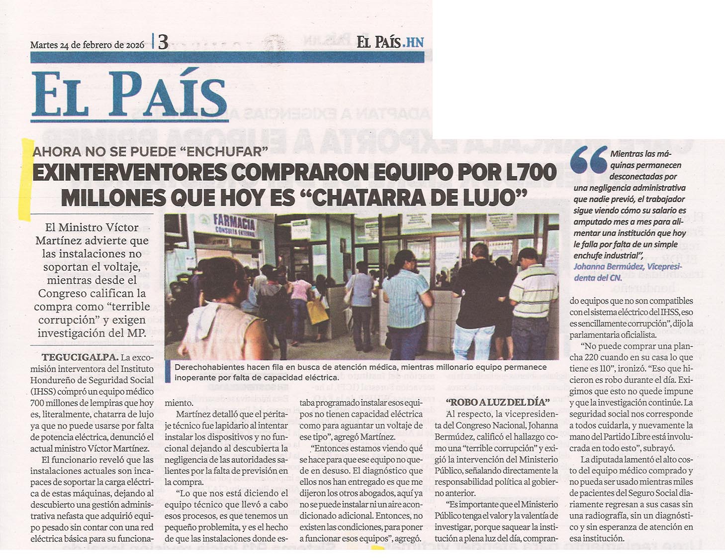 DenunciasNacionales Exinterventores compraron equipo por L700 millones que hoy es «chatarra de lujo» ebueso Diario: El País Fecha: 24 de febrero de 2026 Página: 3