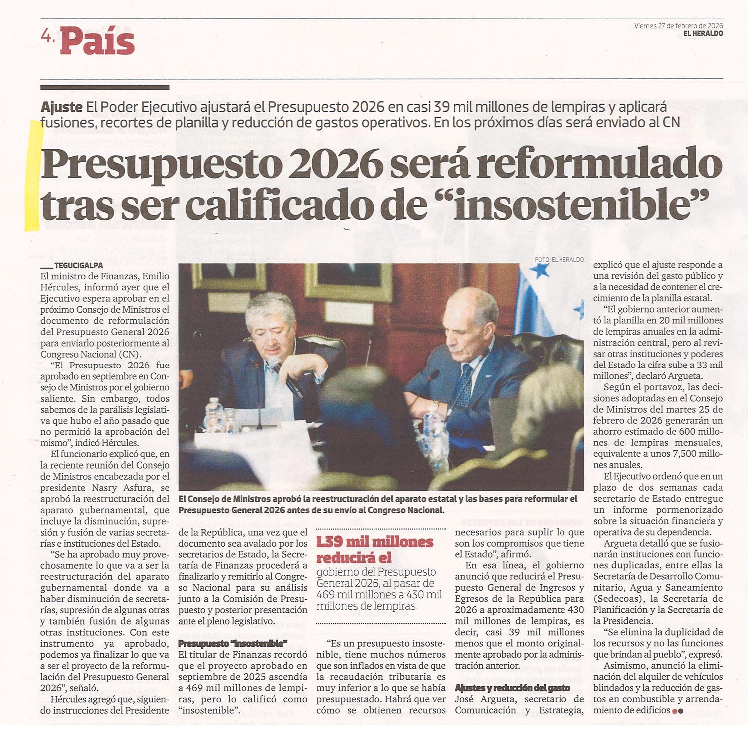 Económico Presupuesto 2026 será reformulado tras ser calificado de «insostenible» ebueso Diario: El Heraldo Fecha: 27 de febrero de 2026 Página: 4