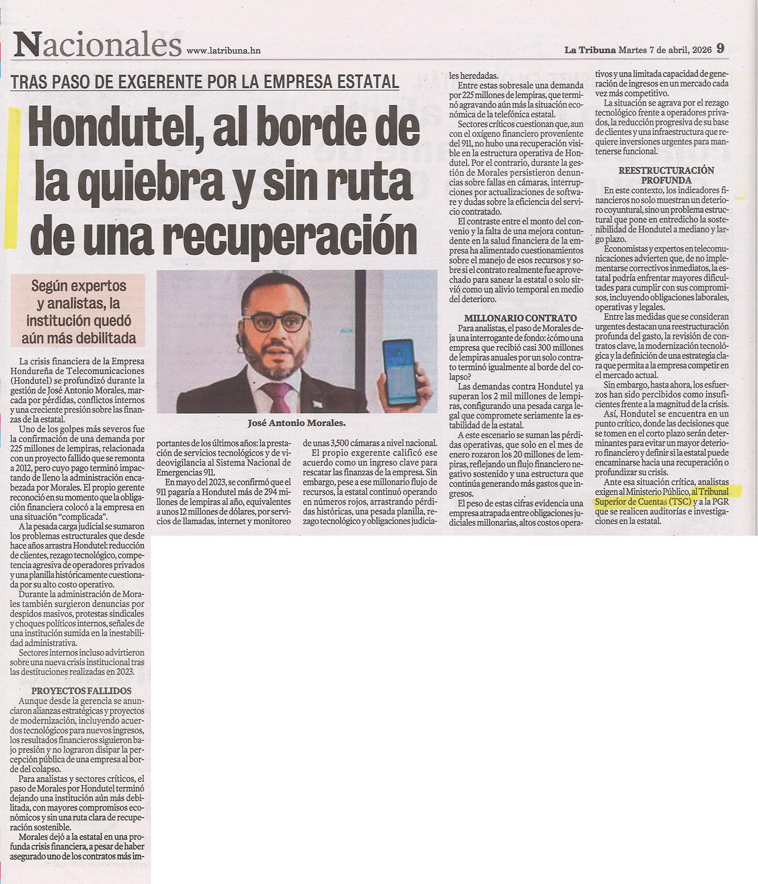 TSC Hondutel, al borde de la quiebra y sin ruta de una recuperación ebueso Diario: La Tribuna Fecha: 7 de abril de 2026 Página: 9